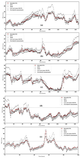 Results of time-series comparison results for the HybridLSTM, DNN, MLR and raw data versus gravimetric measurements at 1-week intervals; (a) 1, (b) 2, (c) 3, (d) 4 and (e) 5 weeks. The dotted line represents the high PM2.5 concentrations. We tested the calibration performance using datasets collected at 1-week intervals. A total of five sections were used (1, 2, 3, 4 and 5 weeks).