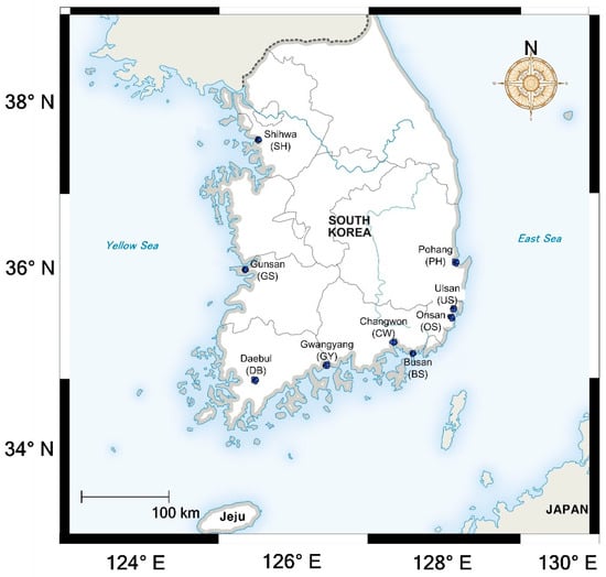Figure 1. Map and sampling stations of nine industrial complexes where RDS was collected in this study. PM10 samples from in this study were separated from bulk RDS samples of our previous study [44]. More detailed information of the study area can be obtained from the previously reported study [44].