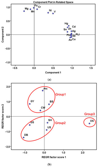 PCA was used again to identify pollution sources that affected the PM10 of the RDS and to classify the pollution characteristics by industry. The data used for PCA were the Igeo values of PTEs identified as being of anthropogenic origin and pollution degree by each industrial complex using PLI. The results are shown in Figure 2a,b. For dimensional reduction, average values of Igeo were used in the analysis. Principal component 1 was heavily loaded with PLI and PTEs (Cu, Zn, As, Ag, Cd, Sn, Sb, Pb and Hg) identified as products of traffic activity in Table 5b (Figure 2a). PC1 explained 60.357% of the total variance (Table S5), thus implying that PTEs from non-exhaust emissions of traffic activity may have strongly affected the pollution level of PM10 in RDS collected from the nine ICs. We classified the metal composition of on-road PM10 by industrial type using the scatter plot of PC1 and PC2 scores obtained from this analysis (Figure 2b). This revealed that ICs were classified into group 1 for PH, BS, CW and GY, and group 2 contained SH, US, GS, DB and OS owing to the metal composition and pollution characteristics of RDS PM10. The larger the factor score, the greater the pollution level. Group 1 (G1) contained major iron/steel ICs in Korea, which is the world’s fifth largest steel producer [36]. Korea’s largest steel companies (including POSCO and HYUNDAI) are in Pohang and Gwangyang [33], and there are large steelmakers in the BS(NS) in CW. Groups 2 (G2) and 3 (G3)are rich in petrochemical industries with fabricated metal industries for automotive and shipbuilding. In particular, Group 3, which only includes OS, is a large non-ferrous industrial complex with smelters that produce non-ferrous elements such as Ag and Ni [125] and includes a highly polluted area where the “Onsan Public Hazardous Disease” historically occurred owing to unknown industrial pollutants in the 1980s [126].