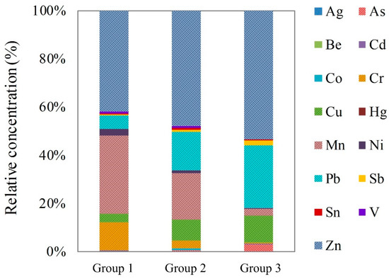 Figure 3. Heavy metal profile of PM10 in RDS from Group 1 (G1, steel industry sites), Group 2 (G2, fabricated metal industrial sites for automobiles and ship building, and petrochemical industrial sites), and Group 3 (G3, Onsan) (Non-ferrous smelting and petrochemical industrial sites).