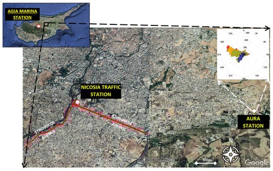 Cyprus is an island-country in the Eastern Mediterranean Sea that is characterized as a sensitive region with multidimensional influences from natural phenomena (e.g., dust episodes, suspended sea-salt particulates from sea-droplet evaporation) which have a significant impact on the air quality of the island []. It has a typical Mediterranean climate, with a hot and dry Summer and wet Winter, separated by short Autumn and Spring. In the context of this study, data were collected from three (3) AQMSs. The Atmospheric Dynamics and Air Quality Monitoring Station—AURA Station, is operated and maintained by the Laboratory-Isle of Excellence of Environmental Fluid Mechanics of the Engineering School of the University of Cyprus. The station is located on the Campus of the University of Cyprus in the Municipality of Aglantzia (Figure 1). More specifically, it is located on the south-eastern side of Nicosia at the northern entrance of the University of Cyprus Campus. It is considered a suburban station as it is located near a road with sparse traffic and agricultural land [].