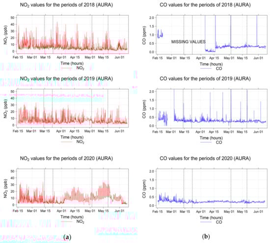 The NO2 and CO concentrations measured at the AURA station during the study period for 2018, 2019 and 2020 are below the Air Quality Standards which are set by the European Union Directive on Air Quality 2008/50/EC, as 8.9 ppm for CO (eight-hour rolling average), and 105 ppb for NO2 (hourly value). Exceedances of the daily value of 50 μg/m3 for PM10 are quite common in the area due to the regular Desert Dust Storms and the resulting transboundary transport of suspended particulate matter. For the study period of 2018, there were 27 daily exceedances, for 2019, there were 4 daily exceedances while, in the corresponding period of 2020, they amounted 8 daily exceedances over a period of 115 days. Table 4 summarizes the numbers of daily exceedances for the three years per period.
