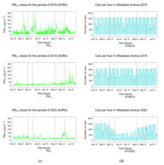 Table 2 summarizes the average number of traffic load per road per hour, for three consecutive years, i.e., 2018, 2019, and 2020. For 2018 and 2019, no significant change in the number of vehicles between periods can be identified. In addition, Table 2 shows the reduction of vehicles for 2020 during the lockdown periods. These traffic load data will be useful and be associated with pollutants during the study period.