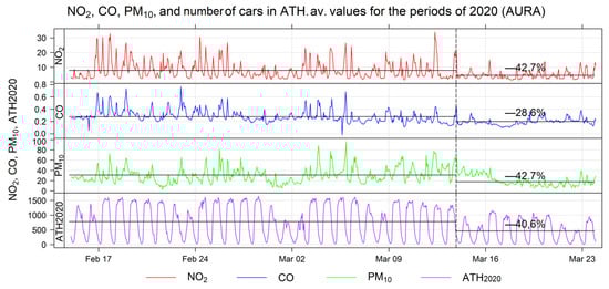 Besides the obvious effects on the public health and economy caused by the pandemic [], the reduced traffic volumes had a chain effect in other sectors, e.g., the environment. Consequently, reduced anthropogenic activity during COVID-19 is expected to play a key role in air quality [,,,,,] due to its strong links with the road traffic and industrial activities.