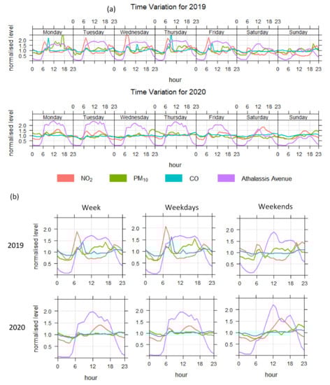 The hourly variation of a pollutant concentration in a day as well as the daily variation within a week can expose important information about the possible sources of origin of a pollutant. Figure 6 shows (a) the temporal trend of the normalized concentrations per day of the week and (b) the temporal trend of the normalized concentrations per hour during the day, for the three study pollutants and the traffic load in Athalassis Avenue for the P2/2019 and P2/2020. The actual values depicted in the graphs are normalized over the mean value to highlight the differences between the daily fluctuations. The values shown in the plots is the 95% confidence interval of the mean.