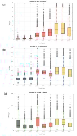 The boxplots presented in Figure 8 summarize the concentration measurements recorded at the 3 stations for 2018, 2019 and 2020 for each pollutant separately, for all study periods. The median value is represented by the line inside the rectangle, while the 25% and 75% percentiles are the upper and lower sides of the rectangle and represent the middle of the lower and upper half of the data, respectively; the extreme values are displayed with a grey cross.
