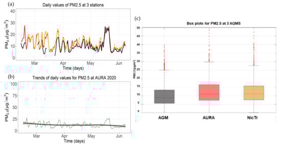 For the sake of completeness, we also present the corresponding results of the available data of the PM2.5 concentrations at the three different stations for the 2020. Figure 9a presents the PM2.5 hourly concentrations at the 3 AQMS stations. What is observed is that the PM2.5 concentrations in urban areas coincide with the measurements of the background concentrations, which is expected due to the significant decrease of the anthropogenic activity during the lockdown period. In addition, Figure 9b PM2.5 illustrates a gradual decrease of the daily averaged values, while at the end of the study period, the corresponding peak of DDS pollution is observed. Figure 9a,b seems to follow the same trend with PM10 of 2020 (Figure 4c and Figure 7c). The hourly PM2.5 boxplots for the three stations confirm this concentration coincidence, with the mean concentration in Nicosia city to be equal to 10 μg/m3.