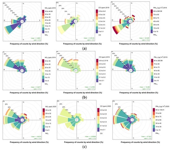 In order to investigate the association of the resulting air pollution with the meteorological conditions, pollution roses were used, as this type of approach can be useful in extracting information about how wind directions may dominate the total concentrations, as demonstrated by R. Henry et al. []. The same technique was used in a similar study on the effect of the COVID-19 lockdown in Northern England, UK [,].