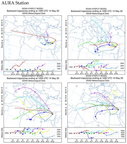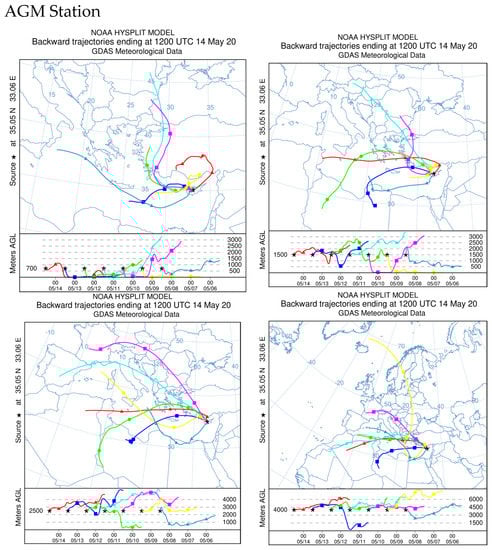 The HYSPLIT model was used to investigate the origin of pollutants concentrations. This model is frequently used—recently, it was used in the case study of Sale city in Morocco []. The model in our case was mainly used to investigate the periods of peak NO2 concentrations related to other regions. The model was used for the area of the AURA station and the background station AGM. The results for the week, where the first NO2 peak concentrations appeared from 06/05 to 14/05 of 2020, are presented in Figure 14. The back trajectories were calculated for 72 h before, at 12:00 (UTC) for the altitudes of 700, 1500, 2500 and 4000 m. Note that both stations, AURA and AGM, displayed the same back trajectory pattern which means that both stations are affected by the same air masses. The same holds true for the back trajectories of the next two weeks. Nevertheless, the station AURA shows unusually high concentrations while, on the contrary, the AGM station does not show the corresponding peaks. It is concluded that the high concentrations that occur around the AURA station are due to a local influence.