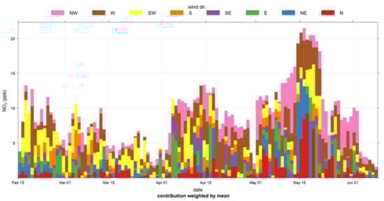 In addition, Figure 15 presents the NO2 concentrations time series as stacked bar charts providing some further insights into the time series data. For a certain period, NO2 concentrations are displayed as a stacked bar chart and the various categories in the bar chart consist of the wind direction. The average period was defined as 1 day, and therefore, the average concentration is plotted according to the ratio of the contribution from the wind. In the Figure 15, the highest concentrations of NO2 are dominated by NW winds where the road network is located, while during the second peak, the winds from the NW and NE have a significant contribution.