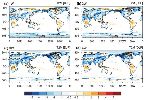 Figure 1 shows the spatial distribution of the weekly mean forecast biases for surface temperature with lead times of 1–4 weeks obtained from GloSea5 and ERA–Interim for the season comprising December, January and February (DJF). The pattern over East Asia, which has a cold temperature on the continent and a warm temperature in the ocean, is one of the most critical driving mechanisms of the EAWM [18]. GloSea5 generally represents the observed temperature patterns well. However, the temperature from the GloSea5 hindcast shows distinct cold biases over the continent in the northern hemisphere, including the East Asia region. Thus, the temperature contrast between the land and the ocean over East Asia in GloSea5 is weaker than that in the observations. In addition, the cold biases in the hindcast increase with an increasing lead time. Meanwhile, there are slight warm biases over some areas of the western Pacific, South America, and the Arctic.