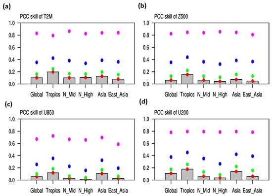 Averaged pattern correlation coefficient (PCC) for (a) surface temperature, (b) 500 hPa geopotential height, (c) 850 hPa zonal wind, and (d) 200 hPa zonal wind. Pink, blue, green, and red dots indicate lead times of 1, 2, 3, and 4 weeks, respectively. Grey bars also indicate a lead time of 4 weeks.