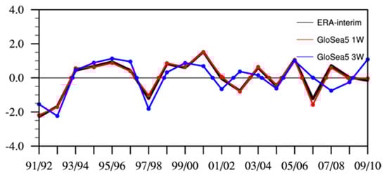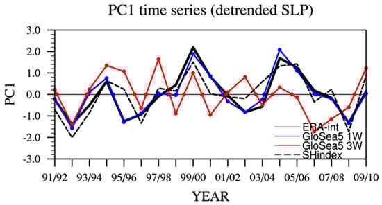Figure 9 shows the principal component (PC) time series of the first leading mode governing the detrended winter sea level pressure, from ERA-Interim and GloSea5 with lead times of 1 and 3 weeks. The PC time series from GloSea5 with a lead time of 1 week captures the interannual variation shown in the reanalysis data. However, the results from GloSea5 with a lead time of 3 weeks show a very different pattern from the observations, especially in the 2000s. The quantitative value of the Siberian high index is defined as the regional mean SLP averaged over the area 40–65° N and 80–120° E in winter, providing a measure of the strength of the Siberian high [31]. The interannual variation of the Siberian high index, representing the expansion or contraction of the Siberian high pressure, which is the characteristic most closely related to the first EOF mode from the surface temperature, is shown with a black dotted line in Figure 9. The time series of the Siberian high index is almost consistent with the observed pattern. In other words, it can be seen that the recent decrease in the EAWM prediction skill is also related to the failure of the simulation of the expansion or reduction of the Siberian high in GloSea5 with a lead time of 3 weeks.