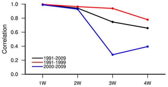 East Asia winter monsoon (EAWM) prediction skills from ERA–Interim and Glosea5 with lead times of 1–4 weeks. (Black), (red) and (blue) lines are averaged for 1991–1999, 1991–1999, and 2000–2009, respectively.
