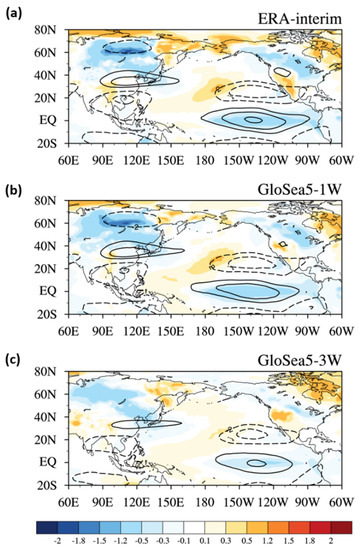 Surface temperature (shaded) and 200 hPa zonal wind (contours) regressed on the East Asia winter monsoon (EAWM) from (a) ERA–Interim, (b) GloSea5 with a lead time of 1 week, and (c) GloSea5 with a lead time of 3 weeks.