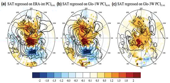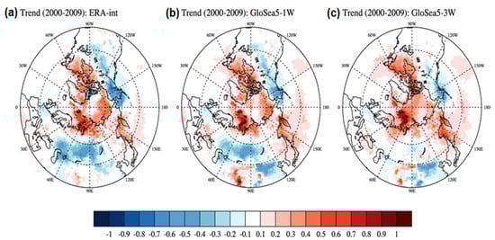 Recently, many studies have discussed the effect of climate variability in the Arctic on the mid-latitudes [26,27,28,29]. These studies indicate that the temperature trends for the mid-latitudes and the Arctic show opposite patterns before and after the late 1990s. In the earlier period, the Arctic shows slight cooling, whereas in the later period, it shows rapid warming. It is well known that the recent cold winters in northern continents are related to Arctic warming; the so-called “warm Arctic–cold continent” pattern enforced via stationary Rossby waves. Labe et al. [29] recently mentioned that these Arctic–mid-latitude linkages show little connection with modeling results, although some model experiments support the observational evidence. To examine whether GloSea5 represents this recent phenomenon well, the linear trends for the surface temperature for the period 2000–2009, from ERA–Interim and GloSea5 with lead times of 1 and 3 weeks, are shown in Figure 6. The Arctic warming and Eurasian cooling trends shown in the reanalysis data are well simulated in the NWP for this period for a lead time of 1 week. The trend is well represented in the subseasonal period with a 3–week lead time, although the cooling strength is slightly weak.