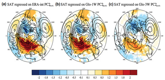The second dominant structure of the EAWM, which explains approximately 20% of the total variance, shows an intensive pressure gradient forming between the Siberian high and the Aleutian low, associated with the main pattern of the EAWM (Figure 8). Gong et al. [30] found a significant out-of-phase relationship between the AO and the EAWM during the period 1951–1999. The negative phase of the AO is concurrent with a strong EAWM, though it could significantly influence the EAWM strengthening related to the Siberian high. Observation showed weakened sea level pressure and warm temperatures over the East Asia region. These patterns are exactly simulated by GloSea5 with a 1-week lead time. GloSea5 with a 3-week lead time generally captures the out-of-phase AO-EAWM relationship well, although its strength is weak.