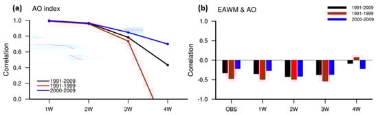 It can be observed that the periods 1991–1999 and 2000–2009 show a negative correlation between the EAWM and the AO. The correlation between the AO and the EAWM in the earlier period tends to slightly decrease in the later period. The relationship in the earlier period is well simulated up to a lead time of 3 weeks; however, the weakened relationship in the later period is more strongly simulated than that observed for lead times of 2 and 3 weeks. Interestingly, for the 4−week lead time, although the correlation in the earlier period shows the opposite result, the correlation in the later period appears similar to the observation. Thus, the effect of the AO simulation on the recent decrease in the EAWM prediction skill in the 2000s, is not significant.