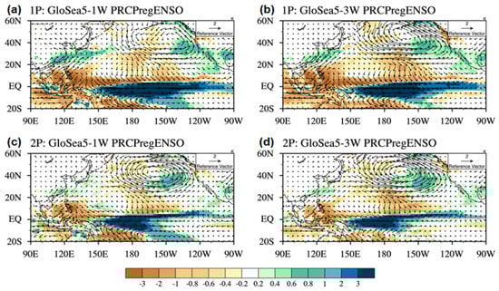 To examine the ENSO-related characteristics in the GloSea5 subseasonal prediction, the precipitation, temperature, and wind fields regressed to the Nino 3.4 index are shown in Figure 11 and Figure 12. The results from the ERA–Interim reanalysis are not shown, because the simulated pattern of association with the ENSO from GloSea5 with a lead time of 1 week mostly matched the observed pattern. In the early period, for positive cases of Nino 3.4 corresponding to the 850 hPa wind pattern related to the ENSO, precipitation decreases over the Maritime Continent and the western Indian Ocean and increases from southern China to southern Japan, compared to the negative cases. This is associated with weak westerlies over the subtropics and weak easterlies over the tropical Indian Ocean and the western North Pacific (Figure 11a). Even when the lead time increases, the relationship between the EAWM and the ENSO is generally well represented. However, the center of equatorial precipitation is weakened and wind circulation in the western North Pacific is overestimated (Figure 11b). In the later period, the center of the equatorial precipitation related to the ENSO shifts to the left, and the rainband from southern China to the south of Japan is weakened. In addition, the low-level circulation in the northeast Pacific is strengthened (Figure 11c). Changes in low-level circulation and precipitation patterns in the 2000s are well represented by GloSea5 with a lead time of 3 weeks (Figure 11d).