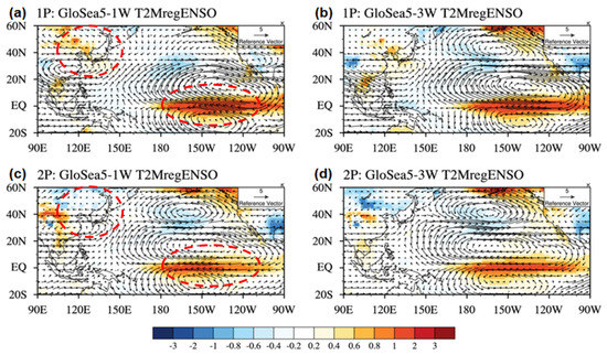 The surface temperature and upper-level circulation regressed onto the Nino 3.4 index are shown in Figure 12. In the earlier period, the high temperature over the central Pacific and the north–south dipole pattern of the upper-level circulation is related to the ENSO (Figure 12a). The temperature and the wind circulation from GloSea5 with a lead time of 3 weeks are generally well represented, although the wind circulation over the northwest Pacific is overestimated (Figure 12b). In the later period, the temperature peak over the central Pacific is shifted to the left and is weakened slightly, similarly to the precipitation pattern (Figure 12c). In addition, the circulation over the northeast Pacific is significantly strengthened and the East Asian jet is slightly weakened. It should be noted that GloSea5 with a lead time of 3 weeks underestimates the weakened circulation over East Asia and overestimates the strengthened circulation over the northeast Pacific (Figure 12d). Interestingly, the surface temperature over the central Pacific and the Korean Peninsula shows the same sign in the earlier period, whereas the sign is reversed in the later period.