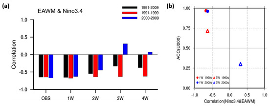 The correlations between the EAWM and the Nino 3.4 index from observation and GloSea5, with various lead times, are plotted in Figure 13a. In the observation, both periods (1991–1999 and 2000–2009) show a negative correlation between the EAWM and Nino 3.4. In the earlier period, the correlation between the EAWM and the ENSO is generally well captured by GloSea5, even when the lead time is increased. However, the recent relationship between the EAWM and the ENSO simulated by GloSea5 is reduced rapidly as the lead time increases, showing different results from the observations. For GloSea5 with a 3-week lead time, the correlation is completely reversed. To examine the cause of the failure to represent this relationship, the prediction skill for the 200 hPa zonal wind over East Asia, which is highly related to the EAWM, is plotted in Figure 13b. As mentioned above, GloSea5 with a 3-week lead time shows a well-simulated 200 hPa zonal wind and relationship between the EAWM and Nino3.4 in the earlier period. However, the prediction skill for the 200 hPa zonal wind in GloSea5 with a 3-week lead time in the later period is significantly reduced as the lead time increases. In other word, it is clear that the failure to simulate the upper wind field in the later period is strongly related to the reduced prediction skill of the EAWM index.