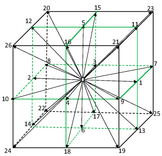 The computation domain is first divided into structured cubic grids. For each grid point (0 point in Figure 1), there are 26 lattice directions and neighbor points. The computational algorithm for RT-LBM takes typical collision and streaming operations for each time step. The collision operation is computed in the terms on the right hand of Equation (4), where the interactions, the scattering and absorption, of the photon with medium particles in every lattice direction are accounted for. The equilibrium PDF is computed as in Equation (9). In the streaming operation, the probability in a grid point is propagated in every direction to neighbor grid points (1 to 26) for the next time step. The macroscopic radiative variables are computed from Equations (5) and (6).