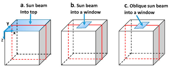 All the incoming solar beam radiation is from the top boundary. The first is the incoming boundary which includes the entire top plane of the computational domain (Figure 2a), the second is the center window incoming boundary condition of the top boundary (Figure 2b), and the third (Figure 2c) is the window incoming boundary with oblique incoming direct solar radiation. A unit radiative intensity at the top surface is prescribed for direct solar radiation,