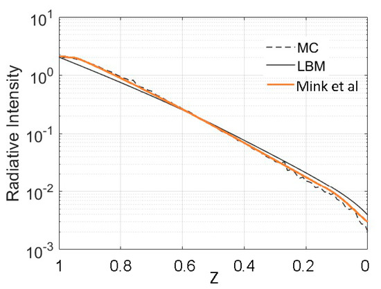 RT-LBM is evaluated with the MC models, since high-density 3-D radiation field data for these kinds of simulation are not available for comparison. Although the MC model generally requires much more computation power, it has been proven to be a versatile and accurate method for modeling radiative transfer processes [1,26,29]. In the following validation cases, the same computation domain setups, boundary conditions, and radiative parameters were used in the RT-LBM and MC models. In these simulations, we set every variable as non-dimensional, including the unit length of the simulation domain in the x, y, and z directions. Normalized, non-dimensional results provide convenience for application of the simulation results. The model domain is a unit cube, with 101 × 101 × 101 grid points in these simulations except in Section 3.3. The top face of the cubic volume is prescribed with a unit of incoming radiation intensity. The rest of the boundary faces are black walls, i.e., there is no incoming radiation and outgoing radiation freely passes out of the lateral and bottom boundaries.