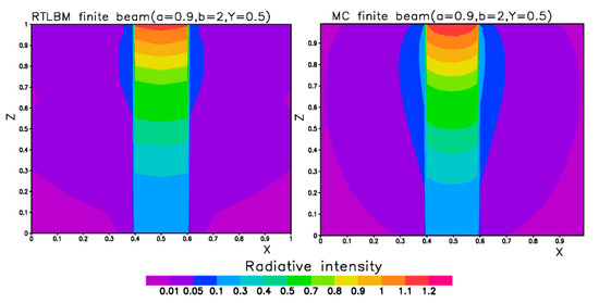 In this case, a perpendicular incoming beam entered a window (0.2 × 0.2) in the middle of the top boundary (Figure 2b). The parameters (a = 0.9, b = 2) of the particular medium are comparable to episodes of heavily polluted atmosphere in some urban areas [33,34,35]. The LBM simulation was also evaluated with our MC model and other MC model [29] results.