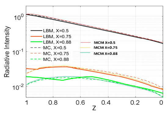 Figure 5 compares our RT-LBM and the MC simulations. The results between the two models matched reasonably well except at the area at the top of the window. Again, the MC model produced slightly larger radiative intensity values near the radiation entrance window. The other area, away from perpendicular to the incoming window, also had much smaller values due to the scattering of the direct beam area for this relatively medium optical depth and large scattering albedo. Some difference between RT-LBM and the MC model was observed in these low-intensity areas. The RT-LBM-simulated slightly smaller values near the incoming radiation boundary are also reported in Mink et al. [29]. Figure 6 compares the line samples in the z direction (Y = 0.5; X = 0.5, 0.75, 0.85) for RT-LBM, our MC model, and the other MC model [29] simulations. The simulations compare well in the centerline, excepting slight differences near the window area. The radiation intensity compares reasonably well but there are slightly more differences off the centerline.