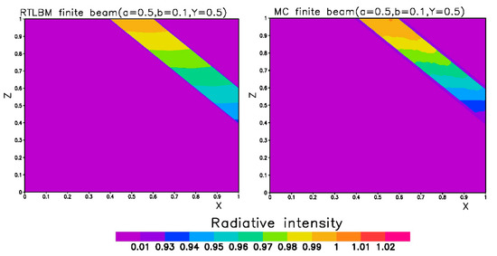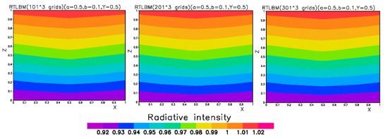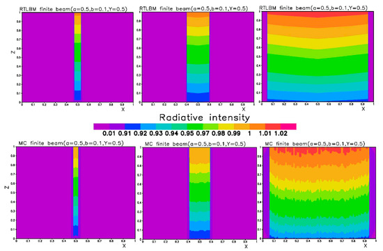 The unit conversion in LBM fluid modeling is complex [37]. However, in this steady-state radiative transfer modeling, the time step is only for the iteration computation and there is no problem to map the non-dimensional variables to variables’ units. Since the LBM-RT in this paper is a steady-state problem, only conversions are needed between physical length and non-dimensional length, and the scattering and absorption coefficients and non-dimensional parameters a and b (a scattering albedo, b optical depth) can be transformed using Equations (10) and (11). The radiation intensity can be converted to a physical unit by multiplying the value of incoming boundary intensity with a physical unit.