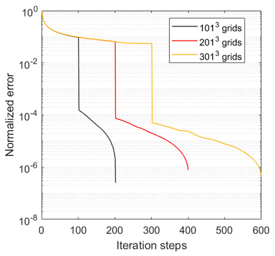 Table 1 and Table 2 list the computational efficiency of our RT-LBM. A computational domain with a direct top beam (Figure 2 and Figure 3) was used for the demonstration. In order to see the domain size effect on computation speed, the computation was carried out for different numbers of the computational nodes (101 × 101 × 101 and 501 × 501 × 201). The RTE is a steady-state equation, and many iterations are required to achieve a steady-state solution. These computations are considered to converge to a steady-state solution when the error norm is less than 10−6. The normalized error or error norm at iteration time step t is defined as:
