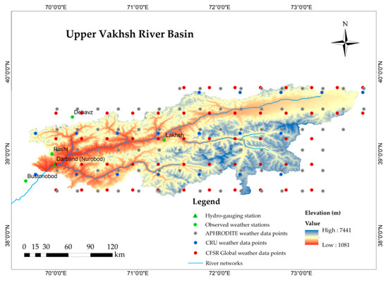 The digital elevation model of the Upper Vakhsh River Basin in Central Asia with the locations of the observed weather and hydro-gauging stations, Climatic Research Unit (CRU), Asian Precipitation Highly Resolved Observational Data Integration Towards the Evaluation of Water Resources (APHRODITE), and Climate Forecast System Reanalysis dataset (CFSR), as well as the global weather data points and streamflow.