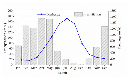 where n is the whole number of sample couples; is the station-recorded discharge variable; is the mean of the station-recorded discharge parameters; is the simulated discharge parameter; is the mean of the simulated discharge parameters; and is the th station-recorded data or simulated data. Moreover, and , while is the linear regression coefficient of the simulated value against station-recorded value, and are the averages of the simulated value against the station-recorded value, and and are the standard deviations of the simulated value against the station-recorded value [70].
