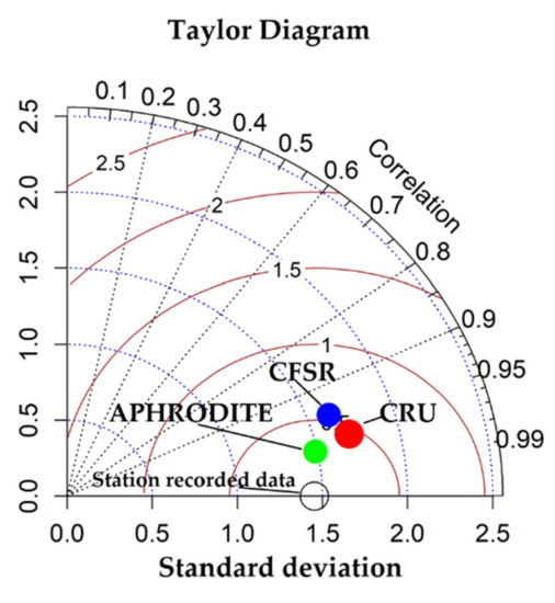 Taylor diagram indicating the performances of CRU, CFSR and APHRODITE precipitation data on a monthly scale at the Lakhsh climate station in the Upper Vakhsh River Basin in Central Asia.