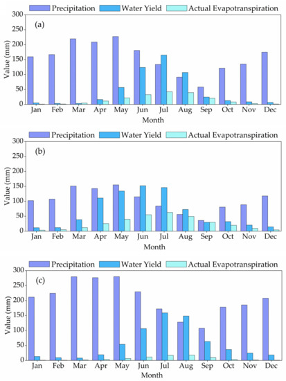 The evaluation of evapotranspiration (ET) is essential for water-resource management and hydrological research. The studies of previous researchers suggested that it is acceptable to apply PET (potential evapotranspiration) in models and water allocations [63,64]. In order to estimate PET, there are three methods given in the SWAT model, including the radiation-based Priestley and Taylor method [65], the temperature-based Hargreaves method [66], and the combined Penman–Monteith method [67,68]. For the present study, the Hargreaves method depends on inputted climate data, which were selected to determine the potential evapotranspiration in a mountainous catchment. The Hargreaves approach is the most commonly used method; it is based on temperature and is recommended by the FAO. Li et al. compared the results of the Hargreaves and Penman–Monteith methods in the Ganjiang River Basin in Southern China by using two different datasets [69]. The results of the analysis showed that there is no significant discrepancy between the Hargreaves and Penman-Monteith methods in terms of streamflow simulations with the same spatial scale. The ET was computed as a function of the corrected potential evapotranspiration, soil depth, soil cover, and plants’ water uptake [52]. Based on each hydrological response unit, the water balance components were simulated, including precipitation partitioning, precipitation interception, evapotranspiration, snowmelt water, the redistribution of soil water content, return flow from shallow aquifers and lateral subsurface flow from the soil profile.