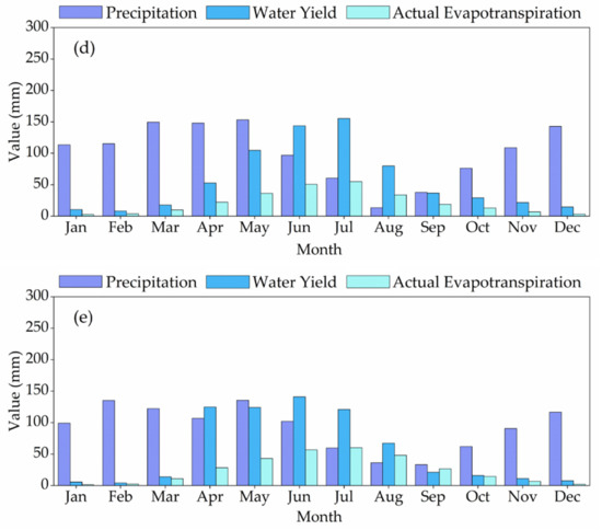 Hydrographic validation between monthly observed and simulated streamflow, when applying the SWAT–CUP tool, at Darband gauging station in the Upper Vakhsh River Basin in Central Asia. (a) Results of the daily precipitation of the APHRODITE_V1101 and daily maximum/minimum temperatures from the CFSR datasets; (b) results of the daily precipitation of the APHRODITE_V1101 and daily maximum/minimum temperatures of the CRU TS3.1 product; (c) results of the daily maximum/minimum temperatures, precipitation, average solar radiation, average wind speed and relative humidity from the CFSR product; (d) results of the daily maximum/minimum temperatures, precipitation from the CRU TS3.1 product; (e) results of the daily maximum/minimum temperatures and precipitation from the observational climate datasets.