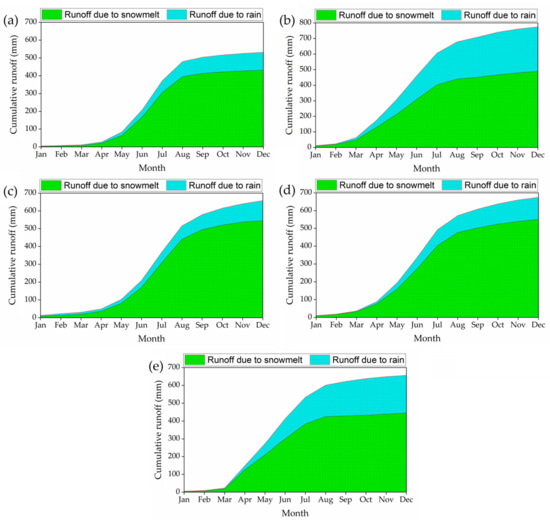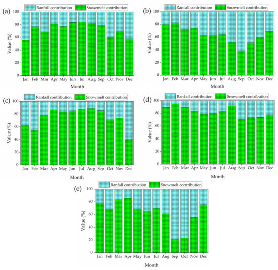 The snowmelt runoff model (SRM) and SWAT model with conventional weather data were used to carry out a water balance study of the Karnali River Basin in Nepal and to simulate the contribution of snowmelt to river runoff [2]. Dhami et al. reported that after comparing the results obtained from the SWAT model and the SRM model, it is recommended to use the results obtained from the SWAT model, which is able to control the volume of melting snow compared to the SRM model [2]. Siderius et al. [24] calculated the contribution of snowmelt to river runoff in the Ganges River in the Himalayan arc, using APHRODITE data with the SWAT model. The simulation results showed that approximately 1% and 5% could be considered indicative of the actual total annual contribution of snowmelt to total runoff [24]. Chiphang et al. [1] used the SWAT model in the mountainous Mago River basin, located in the Eastern Himalayan region of India, from 2006 to 2009 to compute the contribution of snowmelt to streamflow and evapotranspiration changes in the basin. The results showed that the contribution of snowmelt runoff to the annual streamflow of the basin was about 8% [1]. Another study was conducted to simulate snowmelt using the SWAT model in the Tizinafu River Basin (TRB) in Xinjiang, in Central Asia, from 2013 to 2014 using observational climate data [25]. Duan et al. found that about 44.7% of the total runoff comes from snowmelt runoff in the TRB [25].