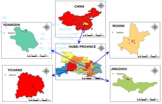 Hubei Province is located in the south of Central China, the middle reaches of the Yangtze River, and the north of Dongting Lake, hence the name Hubei, or “E” for short, and the provincial capital is Wuhan. Hubei lies between 29°05′ and 33°20′ north latitude and 108°21′ and 116°07′ east longitude. It is connected to Anhui to the east, Jiangxi and Hunan to the south, Chongqing to the west, Shaanxi to the northwest, and Henan to the north. Hubei is surrounded by mountains in the east, west, and north, and it has the Jiangshan Plain, which is known as the “land of fish and rice”, in the middle []. The geographical location of Hubei is excellent. Any other province in the country can be reached by crossing two provinces at the most. It is the only province in China where this can be done. For this study, the four cities of Huangshi, Yichang, Jingzhou, and Wuhan within the Hubei Province were selected because of the availability of more monitoring stations and the high number of COVID-19 cases recorded in these cities. Together, these four cities contain 29 air-quality monitoring stations. Huangshi has six, Jingzhou has five, Wuhan has eleven, and Yichang has seven. Figure 1 shows Hubei Province with the selected cities and dots marking the locations of these stations. Most of the monitoring stations are in urban areas because the main pollution exists in these developed areas with more traffic.