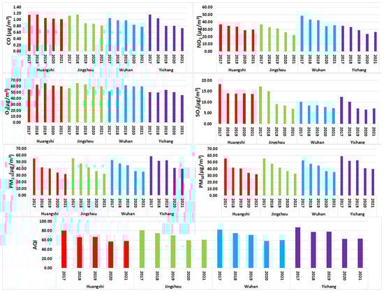 The change in air-quality patterns in the four cities within Hubei Province over the last five years is shown in Figure 2. The AQI level of all four cities is reduced yearly due to continuous air quality monitoring by the government with policy implications for the environment friendly transport system, and it can be observed that until 2020 (before active COVID-19) the AQI was decreasing; however, in the post-COVID-19 period, it began to increase due to an increase in economic development and traffic. A similar pattern was observed for some of the air-quality pollutants, namely NO2 and . The concentration of was increasing in the pre-COVID-19 period, but it reduced after the active-COVID-19 period and continued to decrease in the post-COVID-19 period. The concentration of decreased yearly from 2017 until 2021, but its decrease in 2021 is less notable compared to the active-COVID-19 period.