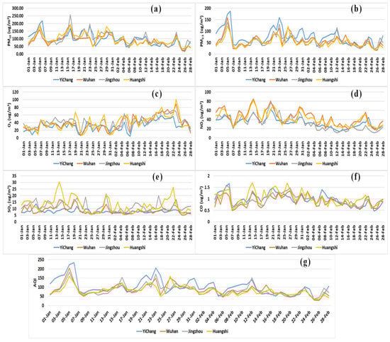 Daily change in air-quality patterns (a) PM10 (b) PM2.5 (c) O3 (d) NO2 (e) SO2 (f) CO (g) AQI.