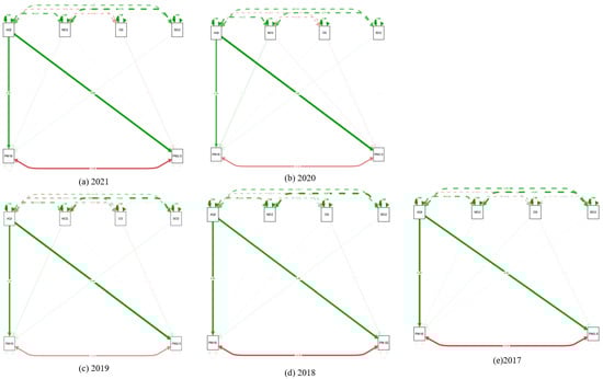 Path analysis graphical representation (a) Year 2021 (b) Year 2020 (c) Year 2019 (d) Year 2018 (e) Year 2017.