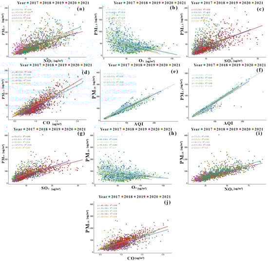 Yearly regression changes in air-quality patterns in Hubei (all four cities) (a) PM2.5 with NO2 (b) PM2.5 with O3 (c) PM2.5 with SO2 (d) PM2.5 with CO (e) PM10 with AQI (f) PM2.5 with AQI (g) PM10 with SO2 (h) PM10 with O3 (i) PM10 with NO2 (j) PM10 with CO.