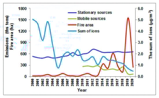 22]. With a relatively stable gross flow of substances into the atmosphere from stationary and mobile sources, and growth in the average areas of burned-out forests from 2014 to 2020, the median values of the total concentrations of ions decreased in the aerosol composition.