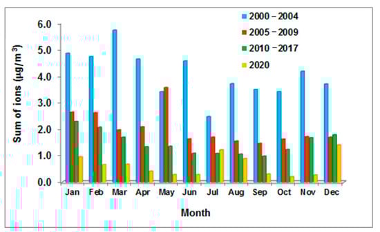 24]. The sum of ions was the most stable between 2010 and 2017 (1.45 ± 0.23 μg·m