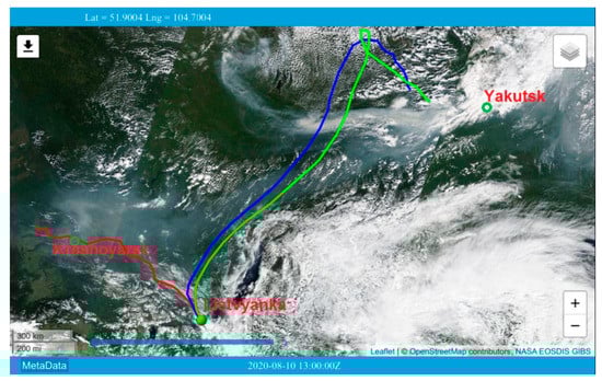 42− increased in the aerosol composition. The analysis of the back trajectories of air masses—which was carried out for each day from 1 June to 30 August 2020—and satellite images revealed that from 26 July to 16 August, smoke from wildfires came from the northern areas of the Irkutsk region and southern areas of Yakutia (