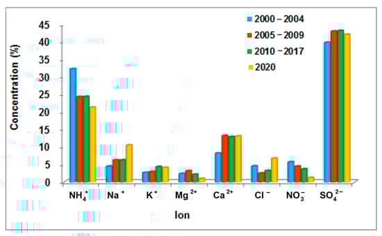 The comparison of the average annual concentrations of ions in precipitation in 2020, involving the same data from previous years, is shown in
