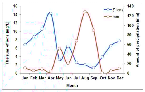 Figure 6). For example, the maximum precipitation in 2020 at the Listvyanka station was recorded in August and September; the lowest concentrations of the average monthly sums of ions were also found during this period. The highest sum of ions was observed in April, with the smallest amount of precipitation (4 mm).