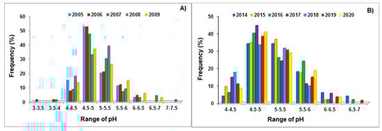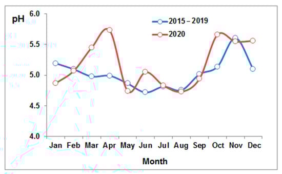 Figure 6). The lowest pH values were observed in May and August 2020, whereas from 2015 to 2019 they were observed in June (see