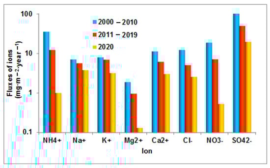 −3); nevertheless, it was 3.3 times lower than in the initial period. In 2020, the median concentration of the sum of ions in the aerosol composition corresponded to 0.46 ± 0.40 μg·m